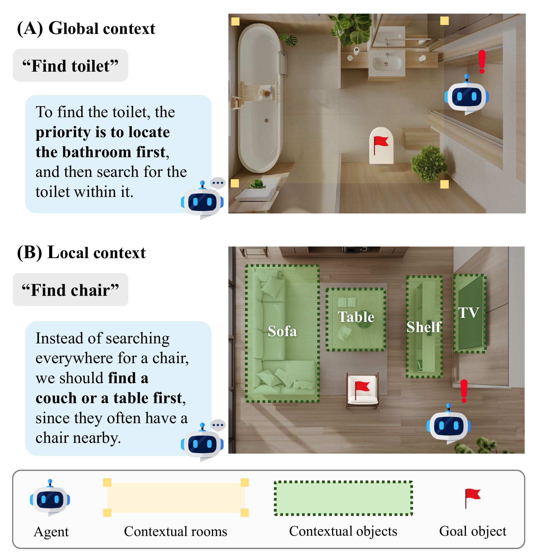 We present CLUE, a novel navigation framework that adaptively balances the use of contextual rooms and objects by leveraging commonsense knowledge extracted from an offline large language model (LLM). By estimating a target’s association with room types using LLM, the agent prioritizes room cues for predictable objects and object cues for those with weak room associations. Our framework constructs a unified semantic value map that integrates both types of contextual information, adaptively weighted by the target’s ambiguity to guide exploration. Combined with multi-viewpoint verification and an exploration strategy informed by contextual cues, CLUE achieves robust and efficient navigation. Extensive experiments in simulation and real-world deployments show that our method consistently outperforms state-of-the-art baselines in both success rate (SR) and success weighted by path length (SPL), demonstrating its effectiveness and practicality for real-world navigation tasks.
