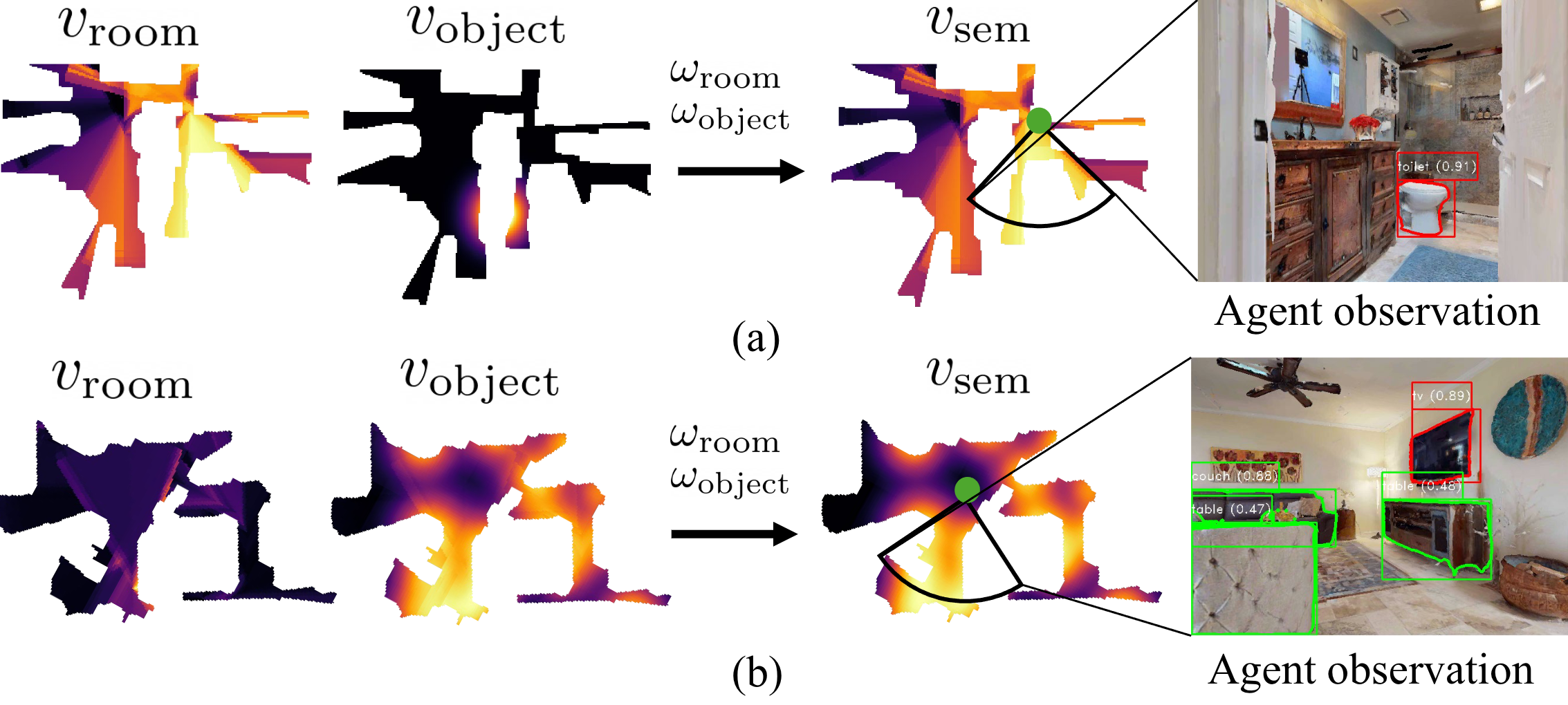 (a) An example of a low-entropy object (toilet), where contextual rooms provide distinctive guidance while contextual objects do not. (b) An example of a high-entropy object (TV), where the unified map is more strongly influenced by local contextual objects due to the lack of distinctive spatial evidence from contextual rooms.